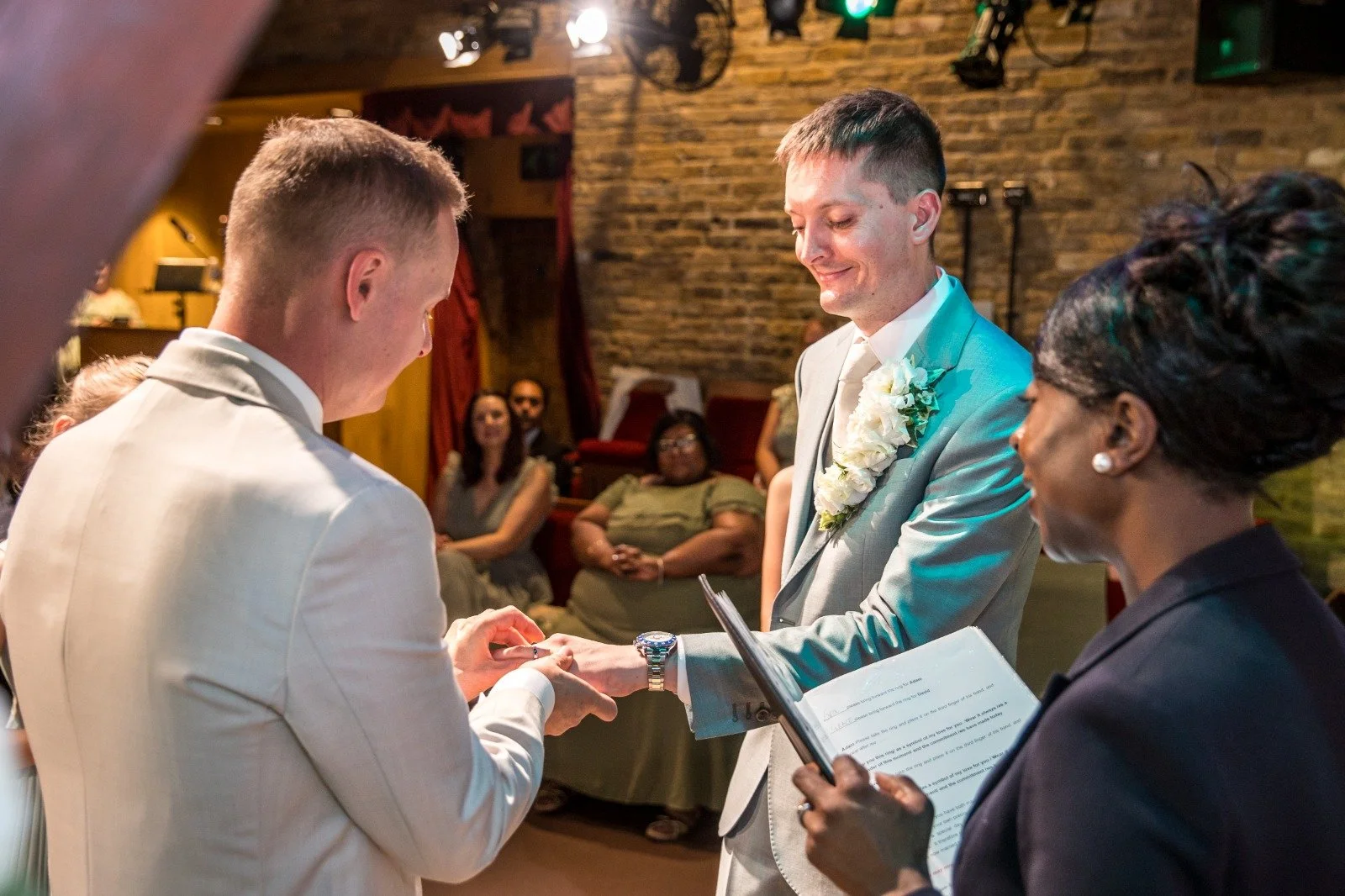 Not every couple has a man or a woman, so gendered terms like ‘husband’, ‘wife’, ‘man’ or ‘woman’ might not fit the people getting married.